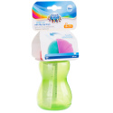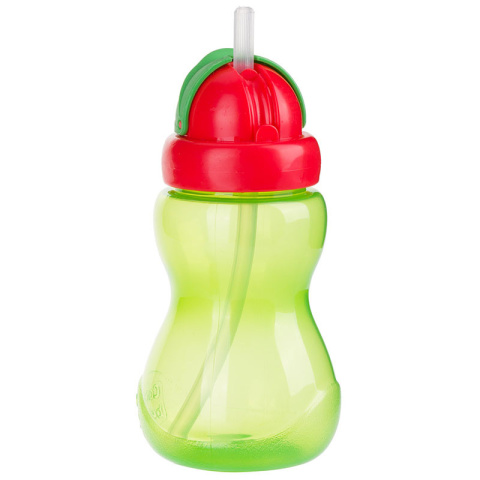 Kolorowy bidon z miękkim, silikonowym ustnikiem, który nie podrażnia delikatnych dziąseł i ząbków dziecka. Posiada praktyczną przykrywkę chroniącą ustnik przed zabrudzeniem, dzięki czemu sprawdzi się na spacerach i w podróży. Silikonowy ustnik jest połączony z plastikową rurką, która kończy się przy dnie bidonu i ułatwia picie napoju. Wyposażony w składaną, silikonową rurkę.Ruchoma część nakrętki pozwala w łatwy i wygodny sposób schować rurkę, zapobiegając niekontrolowanemu wylaniu się napoju.