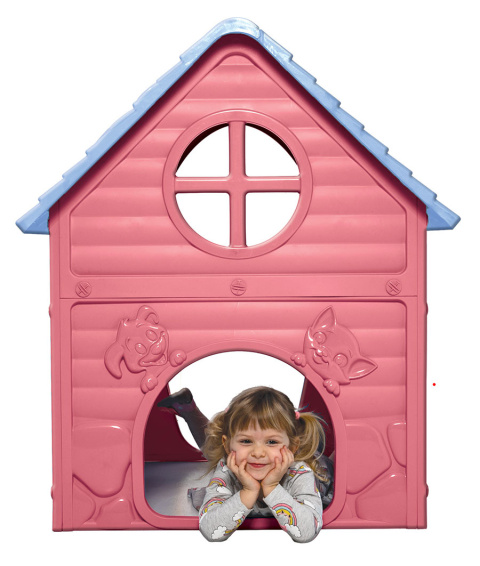 Każda ścianka domku przedstawia motywy różnych zwierzątek : kotka, pieska, czy króliczka, które przyciągają uwagę dziecka. Dom wygląda bardzo realistycznie - ma dach pokryty ''dachówką'' oraz ''elewację z deski''. Domek posiada otwierane okiennice oraz drzwi wejściowe, na których znajduje się skrzynka na listy (otwór w ścianie domku) oraz miejsce na klucz. Dziecko może poczuć się jak w prawdziwym domu! Natomiast z tyłu znajduję się okiennica z kratką, a poniżej dodatkowe wyjście z domu - w formie mniejszego otworu, który może posłużyć jako tunel do czołgania - dzieci uwielbiają ten rodzaj zabawy.