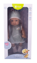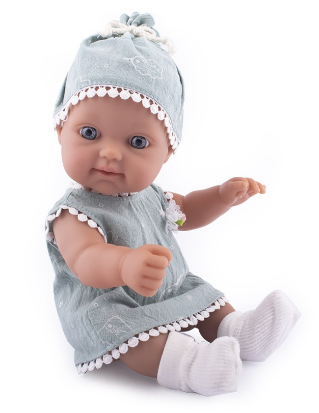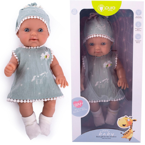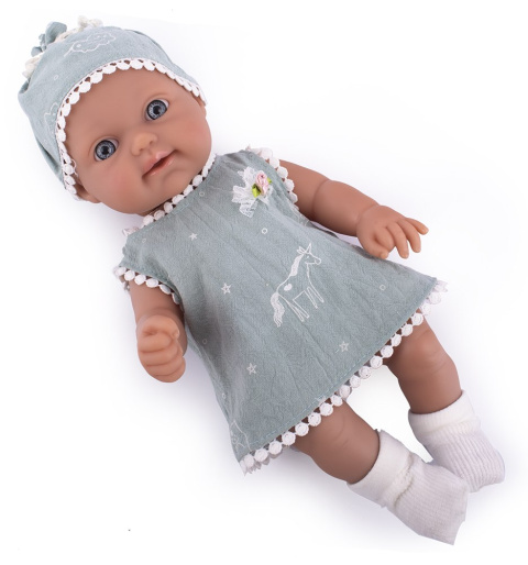 Laleczka pięknie odwzorowuje prawdziwego dzidziusia - oczka, buzia, paluszki u rączek i stópek są bardzo realistyczne, co na pewno zachęci do zabawy nad maluszkiem. Jest przyjemna w dotyku i starannie wykonana z materiałów wysokiej jakości. Laleczka ubrana jest w piękną sukienkę, którą starannie wykończono. W zestawie mamy także czapeczkę z kokardą oraz skarpety. Bobaska można kąpać, ponieważ został wykonany w całości z gumy.