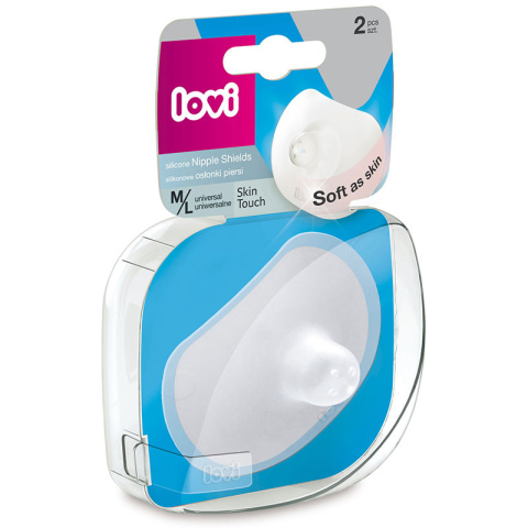 LOVI Silikonowe osłonki na piersi chroniące wrażliwe brodawki sutkowe przed podrażnieniem podczas karmienia piersią. W zestawie 2 szt. w rozmiarze M/L. W zestawie praktyczny pojemnik do przechowywania i sterylizacji.