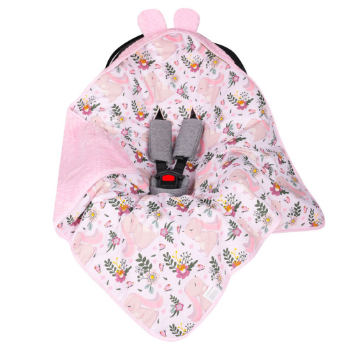 Miękki dwustronny kocyk z kapturkiem OTULACZ - do fotelika, wózka RÓŻOWY Króliczek