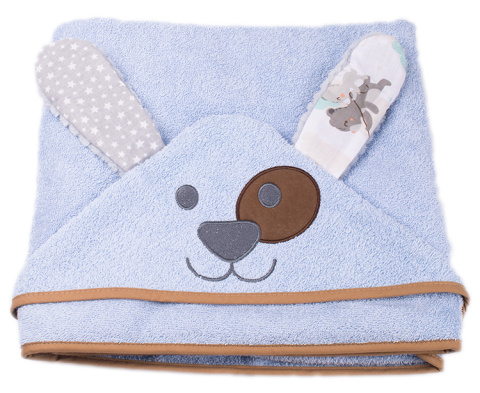 Ręcznik, okrycie kąpielowe z kapturkiem w rozmiarze: 120x100cm. Wykonany w 100% z wysokogatunkowej grubszej bawełnianej tkaniny frotte. Materiał, z jakiego wykonano ręcznik nie podrażnia skóry, a do tego jest bardzo chłonny. Okrycie jest miękkie, delikatne i trwałe w użytkowaniu. Ręczniki z kapturkiem sprawdzają się nie tylko w domu, ale także na plaży i basenie. Starannie uszyty kapturek z sympatycznym pieskiem, komfortowo otuli dziecięcą głowę i umili czas po każdej kąpieli.
