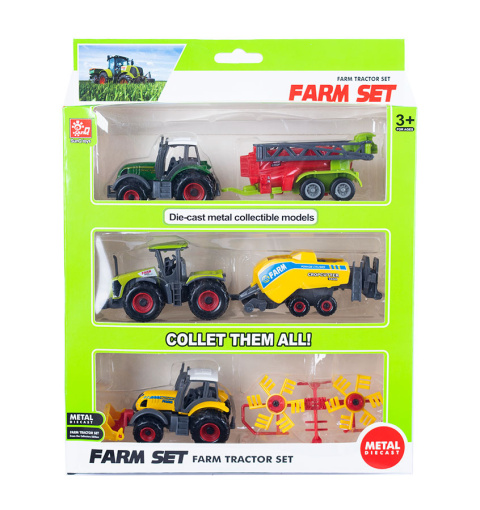 • Traktorki metalowe + przyczepy rolnicze - Zestaw 3 szt. Ciągniki + maszyny rolnicze