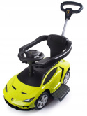 Pojazd posiada oryginalną licencję LAMBOGHINI , wykonany z wysokiej jakości materiałów. Dbałość o szczegóły jest widoczna na każdym z elementów pojazdu. Pojazd może służyć dzieciom w wieku od 2-6 lat. W początkowej fazie pojazd może służyć jako wózek oraz może być przydatny przy stawianiu pierwszych kroków dziecka. Wraz z upływem czasu można zdemontować poszczególne elementy pojazdu: barierki zabezpieczające, pchacz, oraz podnóżki. Po ich demontażu dziecko może korzystać z pojazdu nawet do wieku 6 lat.